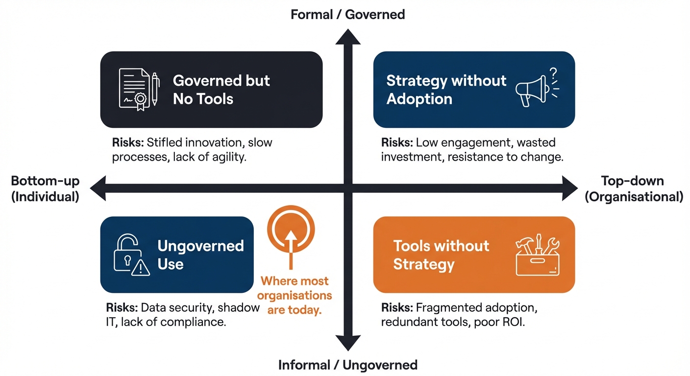 Most organisations are somewhere in the middle: a top-down strategy that is either just starting or partially deployed, alongside a messy reality of individual bottom-up experimentation that is already happening.