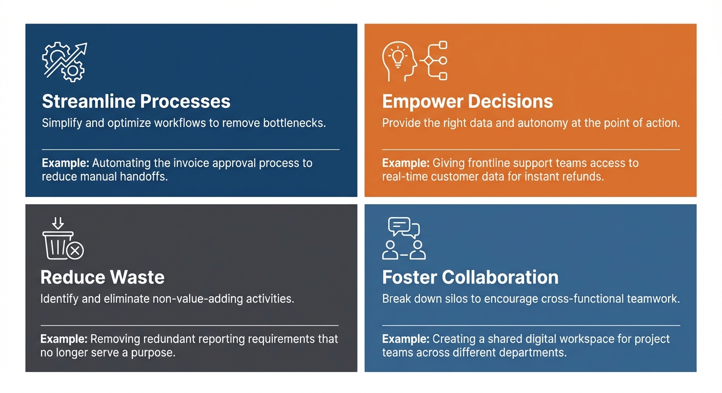 1. Reduce waste — Where does your team spend time on tasks that add no direct value? Duplicate data entry, reformatting documents that have already been produced elsewhere, manual chasing and follow-up that could be triggered automatically.