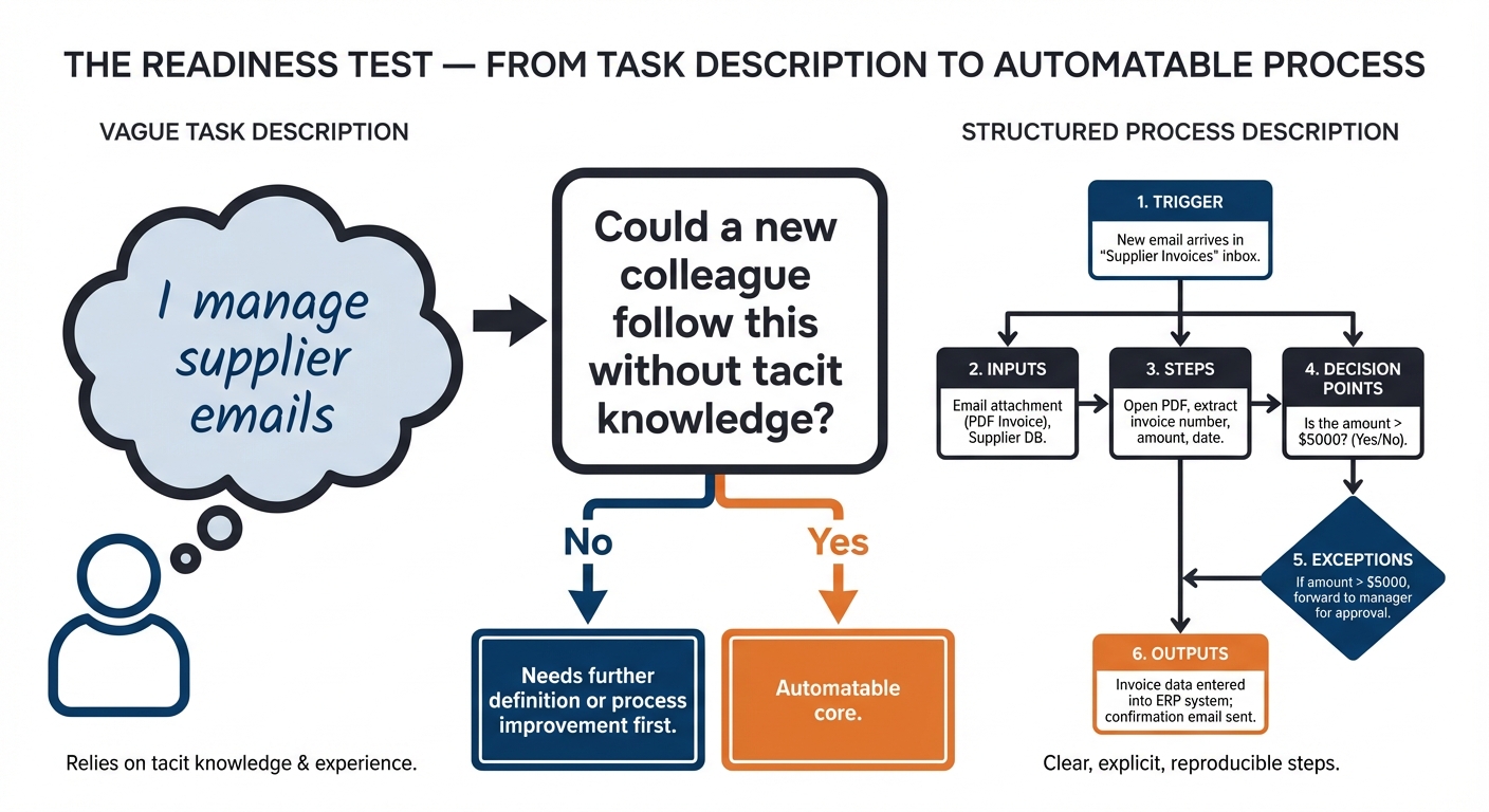 Consider the difference between these two descriptions of the same work. The first: "I spend a lot of time on emails." The second: "Our team receives approximately 20 supplier enquiry emails per day. Each email is read, classified into one of five standard categories, and either answered from a template or escalated to a senior colleague. The output is a logged response within 24 hours. Around 15% of emails do not fit the standard categories and require manual judgement." The second description is a process. You can see where automation might help — the classification step, the template matching, the logging — and where human judgement remains essential. You cannot see any of that in the first description.