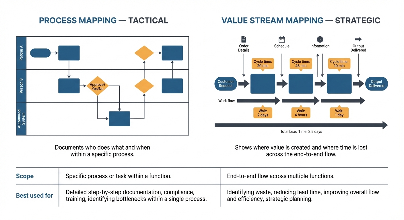 The practical distinction between the two techniques is one of scope and strategic intent. Process mapping is tactical: it documents and clarifies how a specific task or workflow is performed, and it is ideal for identifying the automation opportunity within a process you have already selected. VSM is more strategic: it evaluates the entire value chain to identify where the biggest bottlenecks, delays, and waste exist before deciding where to focus. Organisations use VSM to prioritise improvement and automation work rather than to design the automation itself.