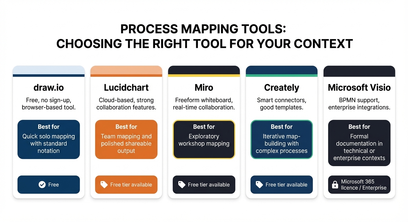 You do not need specialist software to produce a workflow map, and the tool you use matters far less than the quality of your thinking. That said, the right tool makes the process noticeably faster — particularly when you need to share your map with colleagues or revise it based on feedback. Below is an overview of the main options available, from free and accessible to enterprise-level. It is not necessary to try all the tools below, pick one that suits your organisation or your style to focus on!