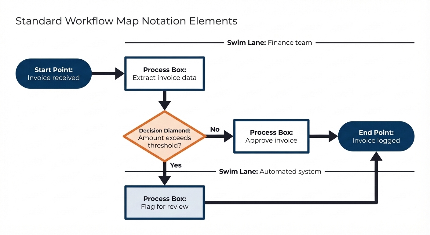 Workflow maps use a consistent visual language so that anyone familiar with the notation can read a map they have never seen before. The core elements are straightforward.