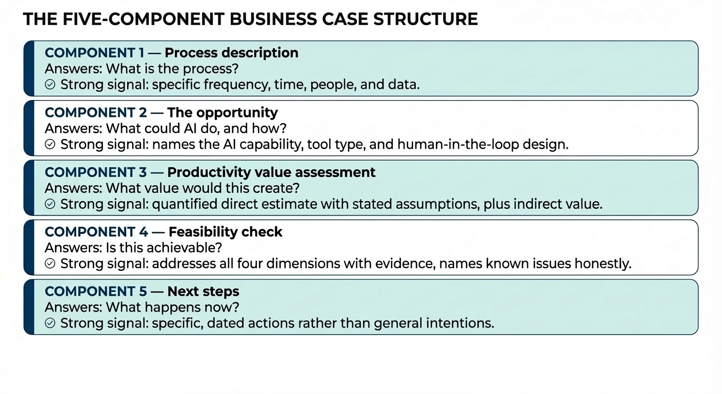 Your business case should be approximately 600 to 900 words, structured across five components. It does not need to read like a corporate document — clear, specific, direct prose is more effective than formal language. Attach your workflow map from Unit 3 and include your suitability scoring summary as supporting evidence. Together, these three artefacts — the business case, the map, and the scoring — constitute your gateway submission.