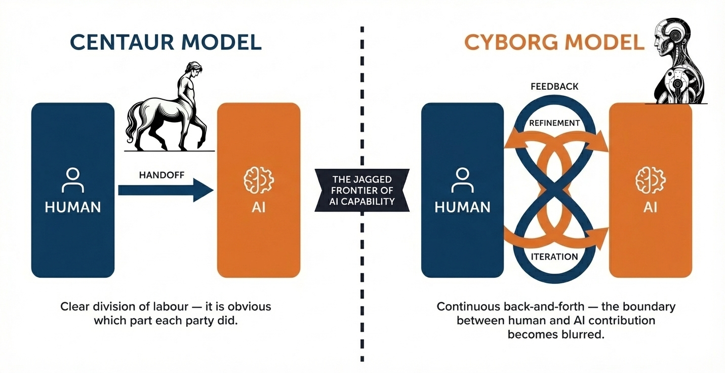 The second pattern is the cyborg model, where human and AI work in a continuous, iterative back-and-forth rather than taking turns at discrete tasks. The human is always involved; the AI is always present as an active participant. The interaction moves back and forth across what researchers call the "jagged frontier" of AI capability — the uneven boundary between what AI does reliably and where human judgement is still essential. In a cyborg workflow, it is often difficult, if not impossible, to say afterwards which part the human wrote and which the AI produced.