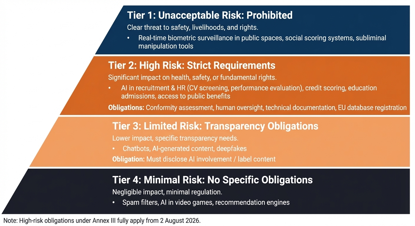 Unlike the UK's principles-based framework, the EU AI Act takes a legislative, risk-tiered approach. AI systems are categorised into four tiers, each with distinct obligations:
