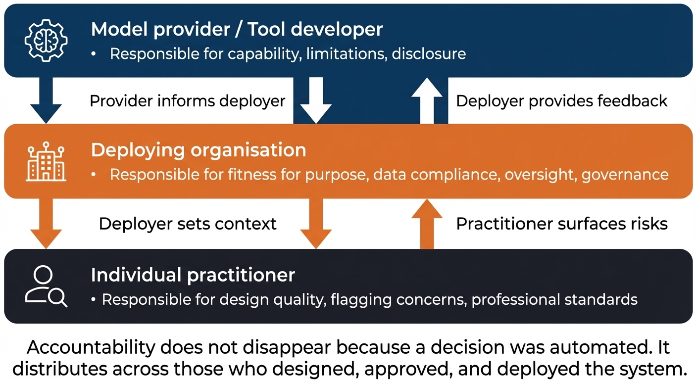 - Explain who holds accountability when an AI system causes harm, and describe the chain of responsibility from model provider to deploying organisation to individual practitioner